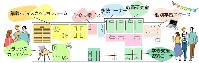 A.国際学部開設に合わせ新設されるSALCには、英語の発音に関する自主学習スペースや学修支援デスク、英語の副読本等の資料コーナーなど、学生が授業以外でも自由に学べる空間となる予定です。グループワーク(ディスカッション)スペースやカフェスペースもあり、「English café」や「TOEIC対策講座」などのイベント実施を企画しています。