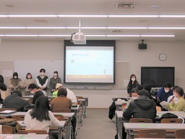 地域福祉コースの澤邉みさ子教授と小関久恵准教授が担当するプロジェクト型応用演習「障害者アートによる地域コミュニティづくり」では、ソーシャルデザインの観点から障害者アートや地域コミュニティづくりを体験的に学ぶことを目的として「酒田市の障害者アート展」の企画検討を行っており、1月20日(金)に最終の企画発表会が行われました。1グループ5~6名の8組がグループごとに発表。各グループは外部講師の講話やフィールドワークを通して深めた障害者アートへの理解に自分たちの興味や関心、グループで話し合った内容を掛け合わせて企画に落とし込みました。キャッチコピーやコンセプト、ターゲット、関係する団体、期待される効果などを発表資料にまとめて発表を行いました。